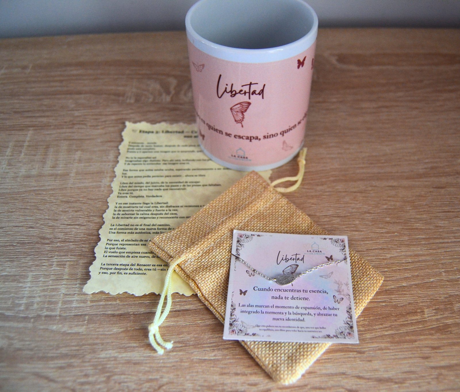 El pack regalo libertad simboliza un nuevo comienzo. Incluye pulsera, taza e historia inspiradora para acompañar procesos de crecimiento personal. Un recordatorio diario de tu fuerza, de soltar lo que pesa y avanzar hacia una vida más auténtica, ligera y consciente.
